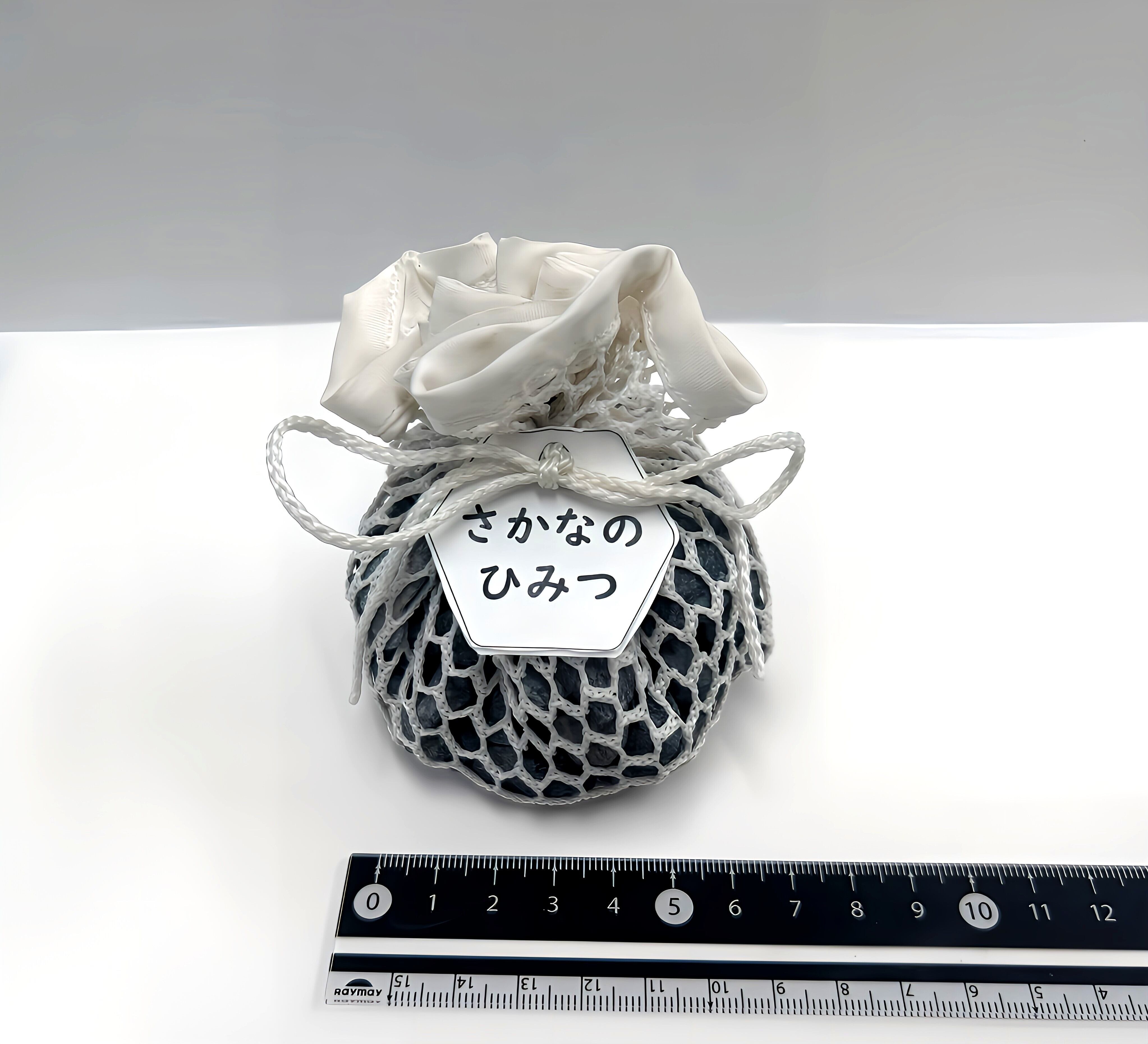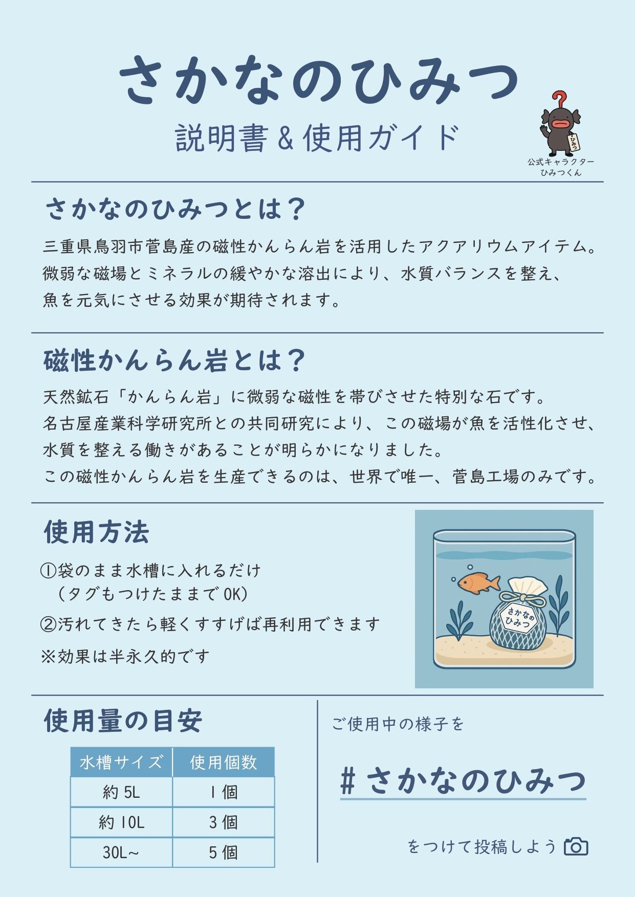 『さかなのひみつ』は、三重県鳥羽市で採掘される天然鉱石「磁性かんらん岩」を、特殊なネットに包んだ新しいアクアリウムアイテムです。